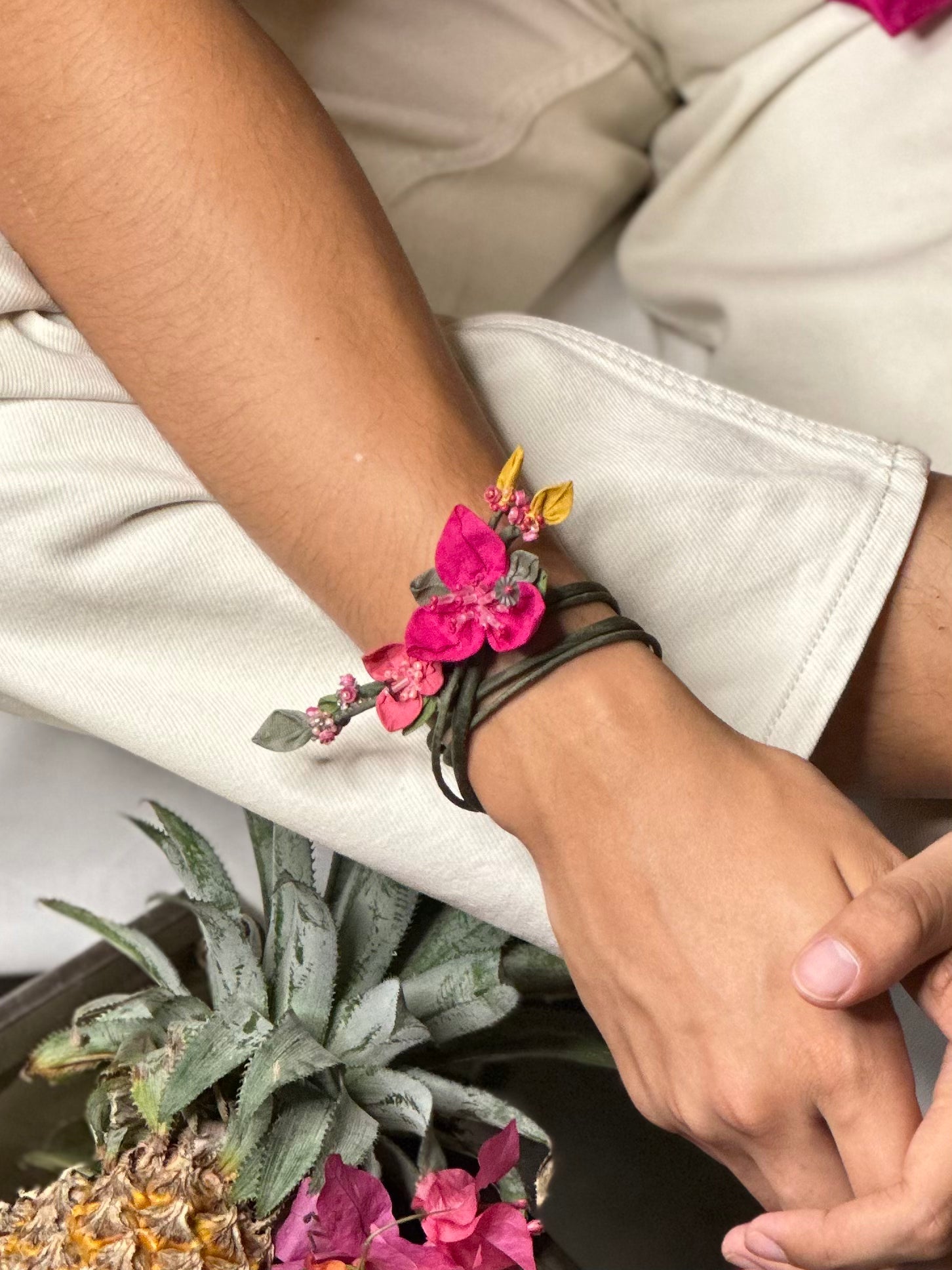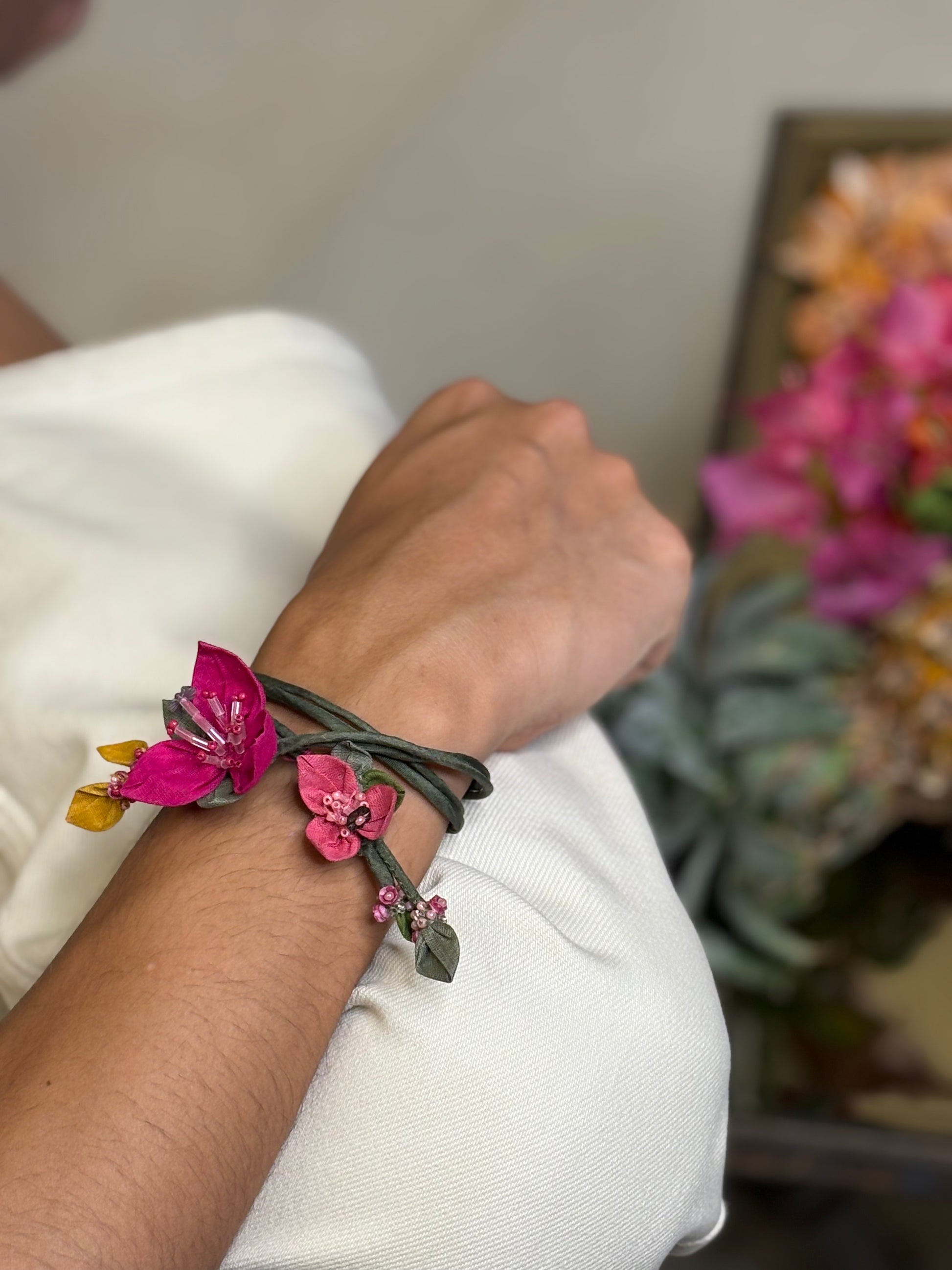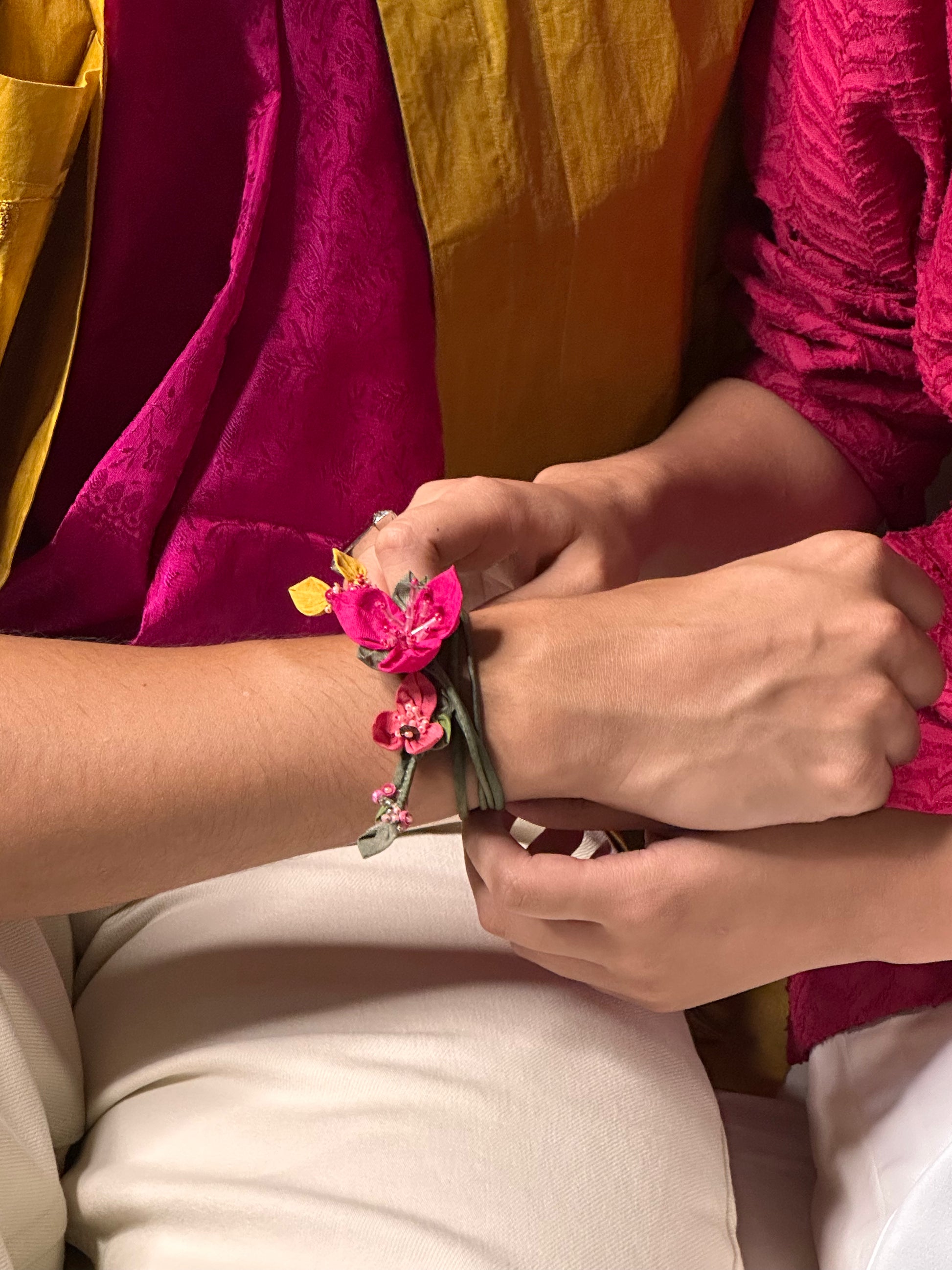 Featuring a raw bougainvillea-inspired centerpiece, this rakhi carries the imperfect charm of something made with love, not machines.
