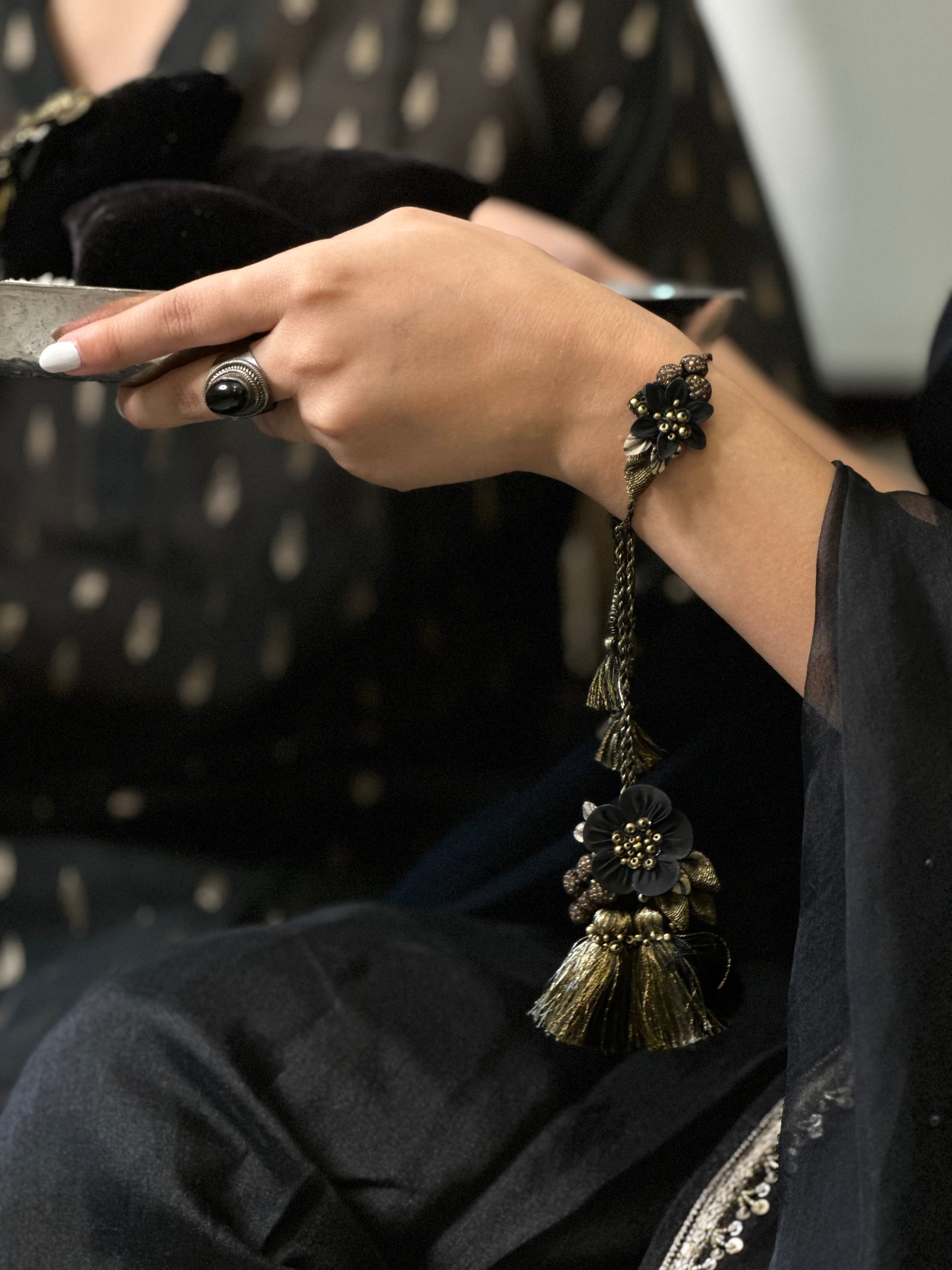 The loomba is made with a flexible loop fit, so it wears like a bracelet — light, graceful, and feminine, yet beautifully coordinated with the rakhi.