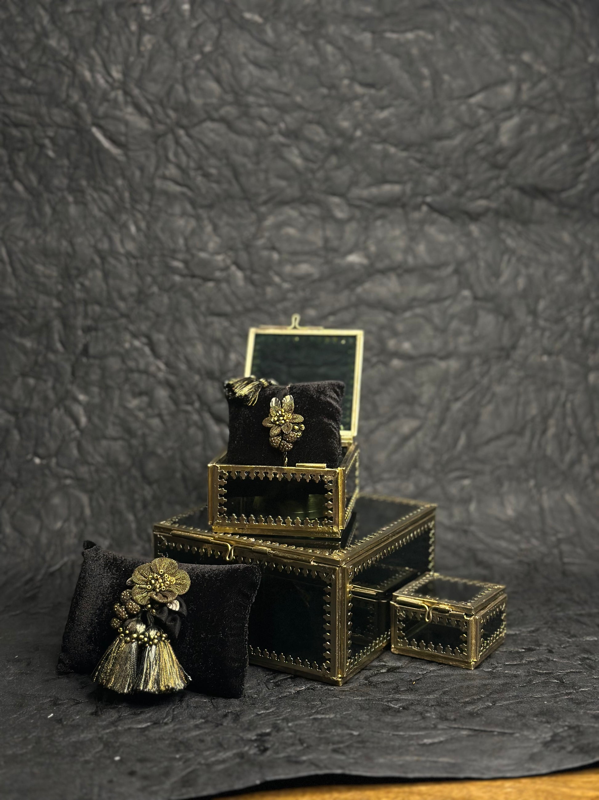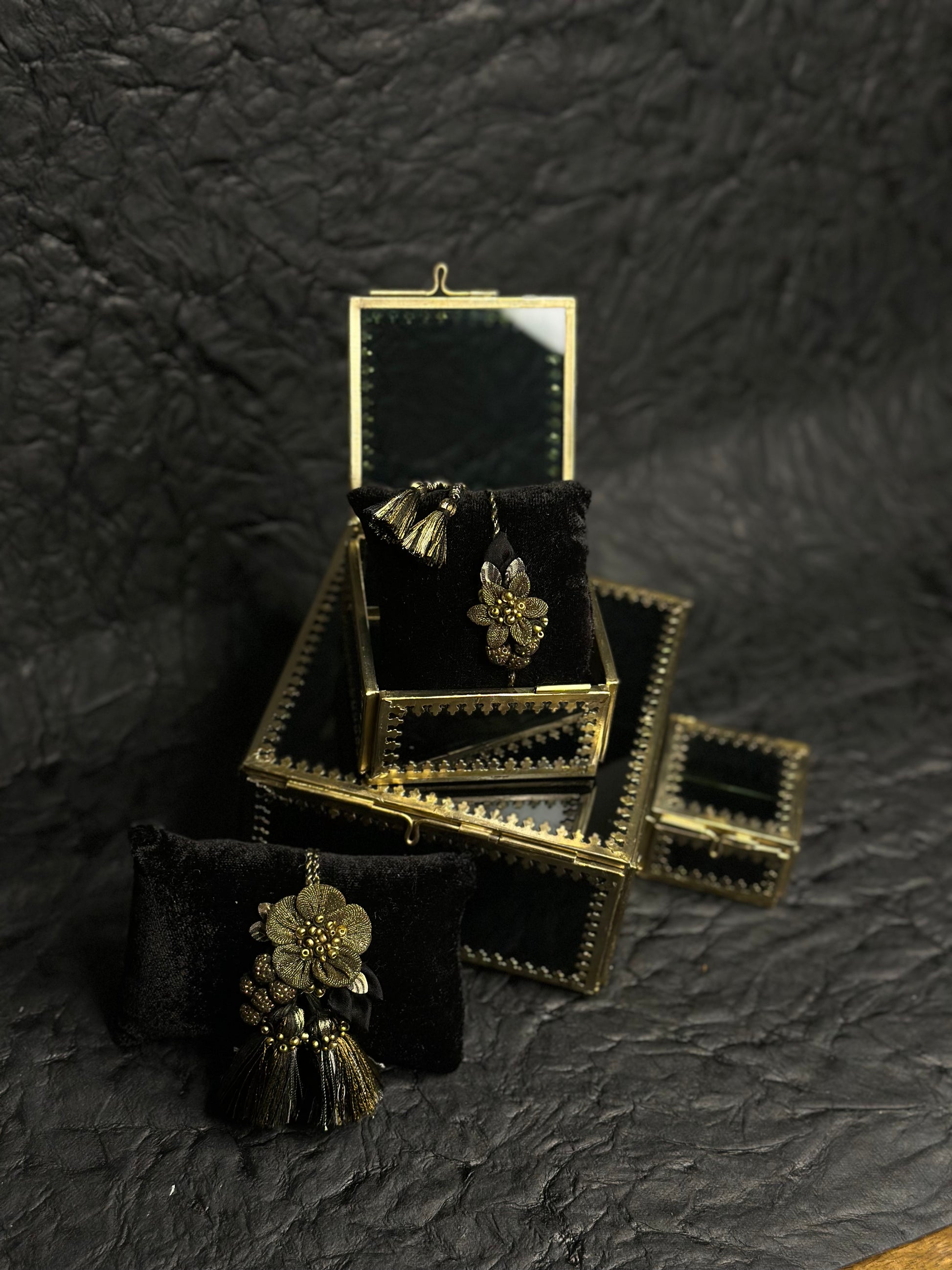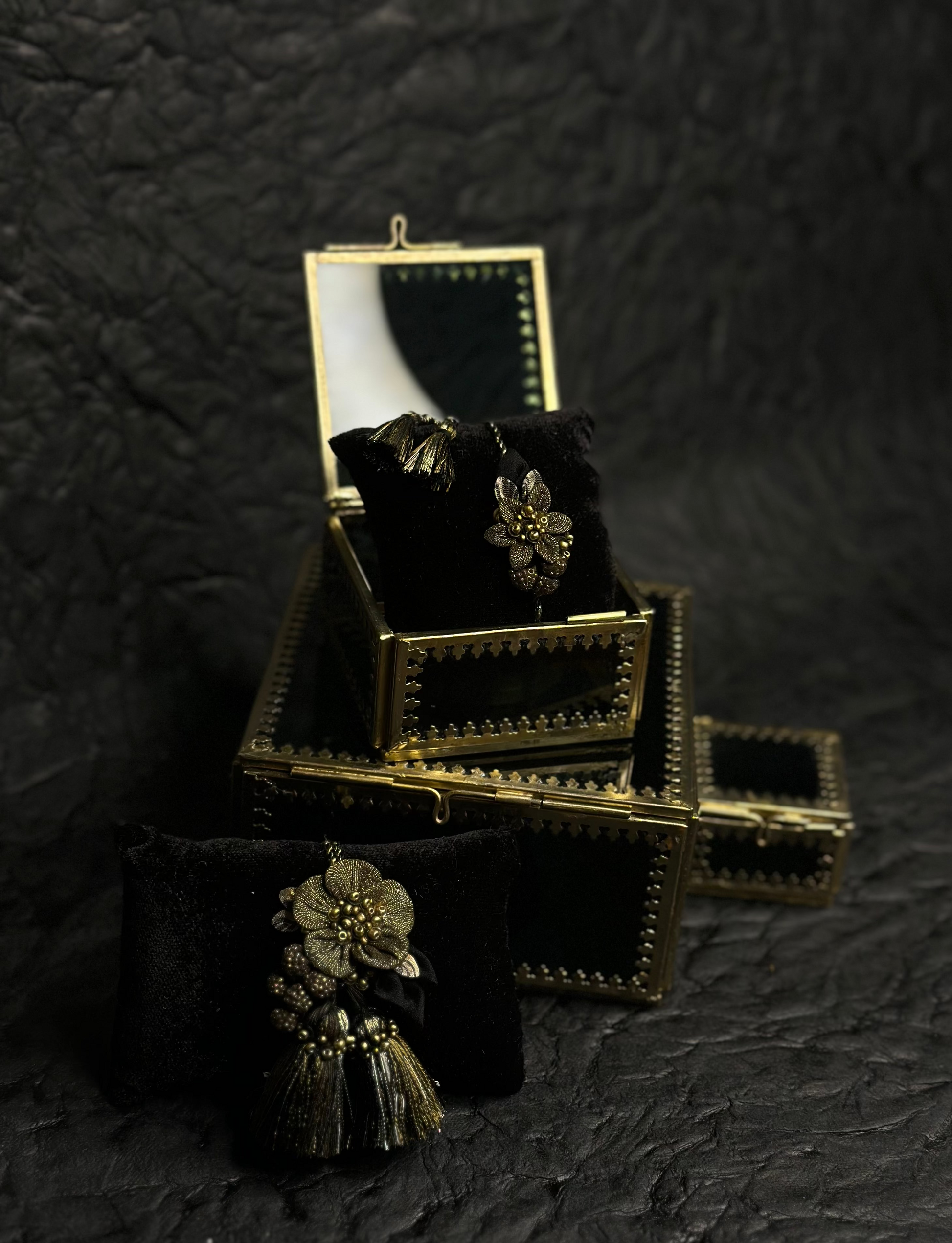 The centerpiece on both pieces catches light softly, creating a glow that feels celebratory but never over-the-top — the perfect balance of shimmer and grace.