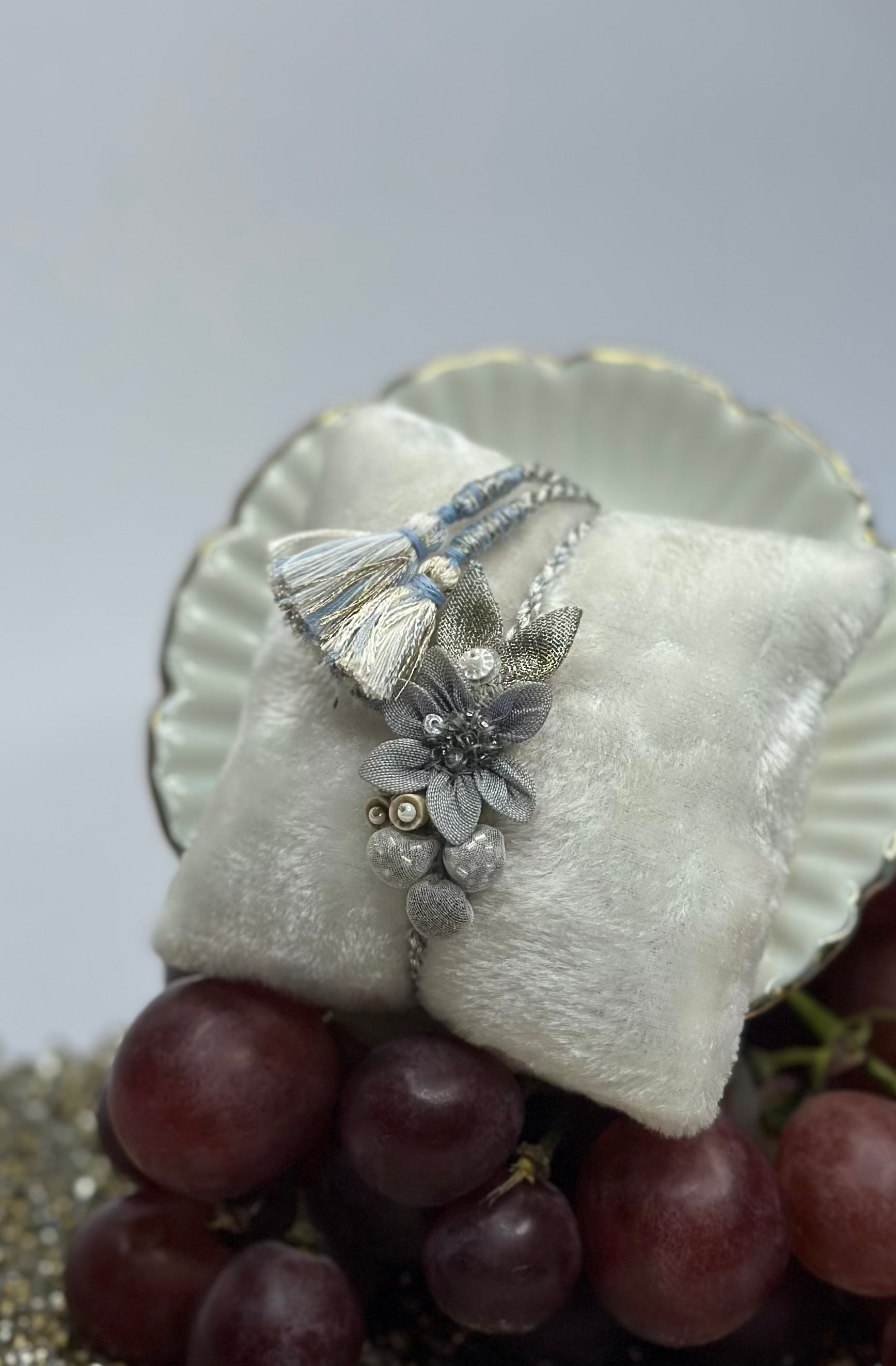 Sometimes, the simplest things say the most. The Celestial Shimmer Rakhi in Grey is designed for that quiet strength — the kind of bond that doesn’t need too many words. With a soft grey thread and a radiant crystal centerpiece, this rakhi blends modern minimalism with a timeless sense of love and care.