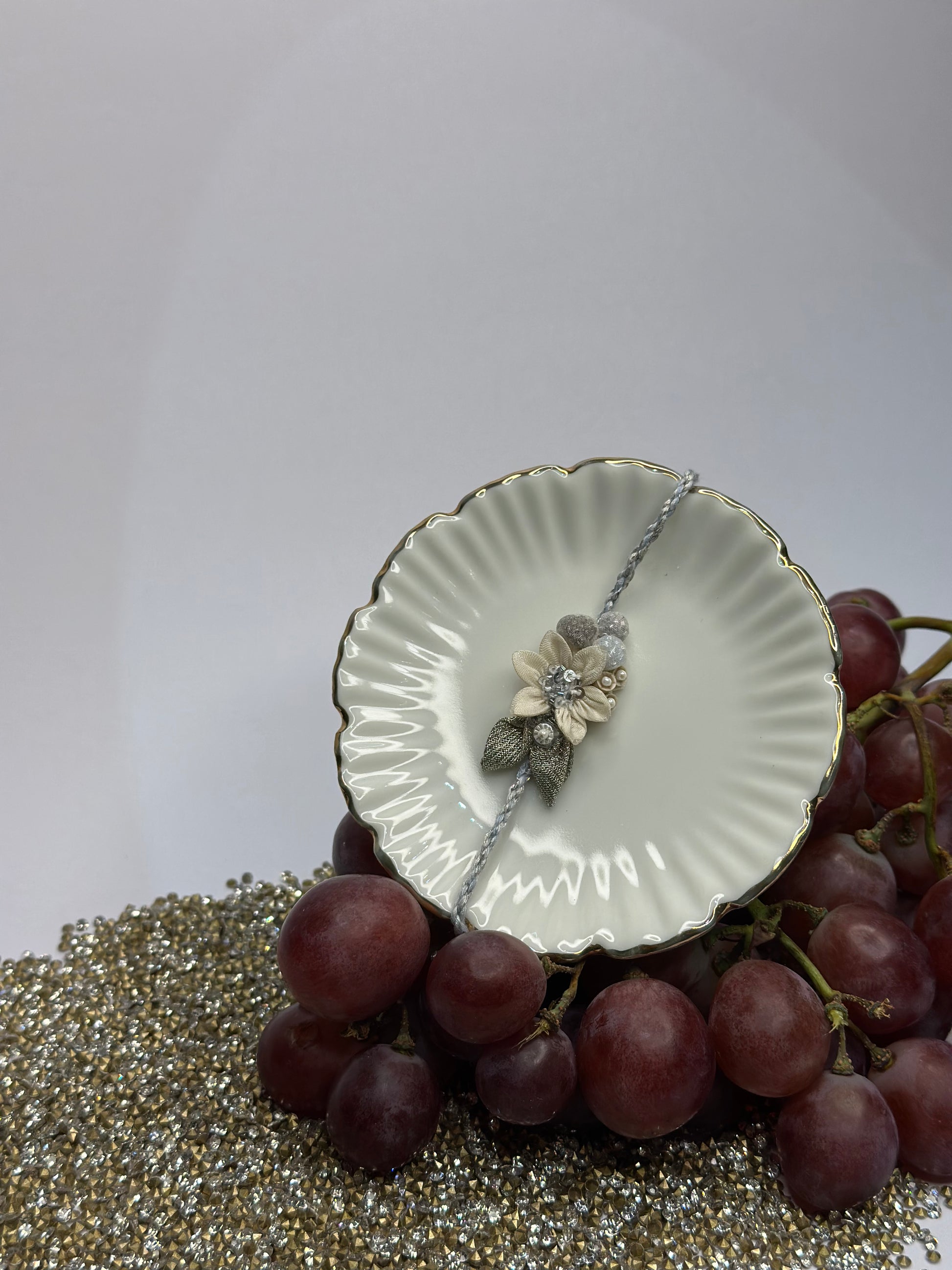 Introducing the Celestial Shimmer Single Rakhi in White — a delicate expression of sibling love wrapped in ethereal elegance. Featuring a lustrous centerpiece that gently reflects the light, this rakhi is hand-tied with soft, pristine white threads that evoke purity, peace, and devotion. Its minimalist charm and refined detailing make it a perfect blend of tradition and modern sophistication.
