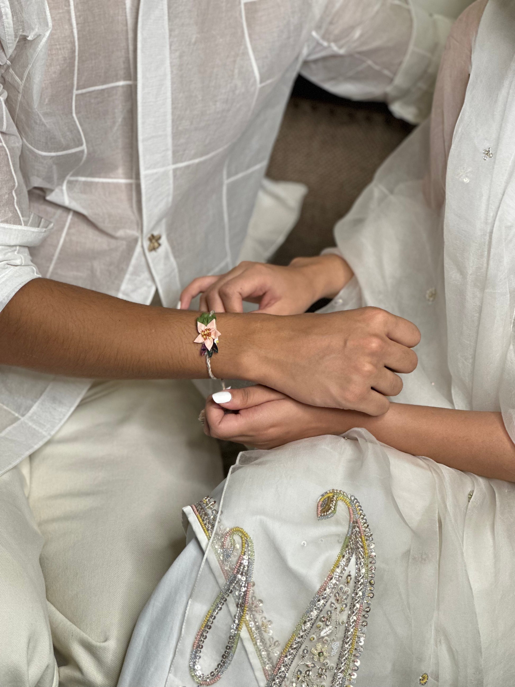 The Origami Floral Rakhi in Baby Pink brings together the art of delicate hand-folding and the warmth of sibling love. With a softly crafted floral centerpiece and pastel pink threads, this rakhi captures a quiet kind of beauty — ideal for the brother who’s been your comfort, your strength, and your forever friend.