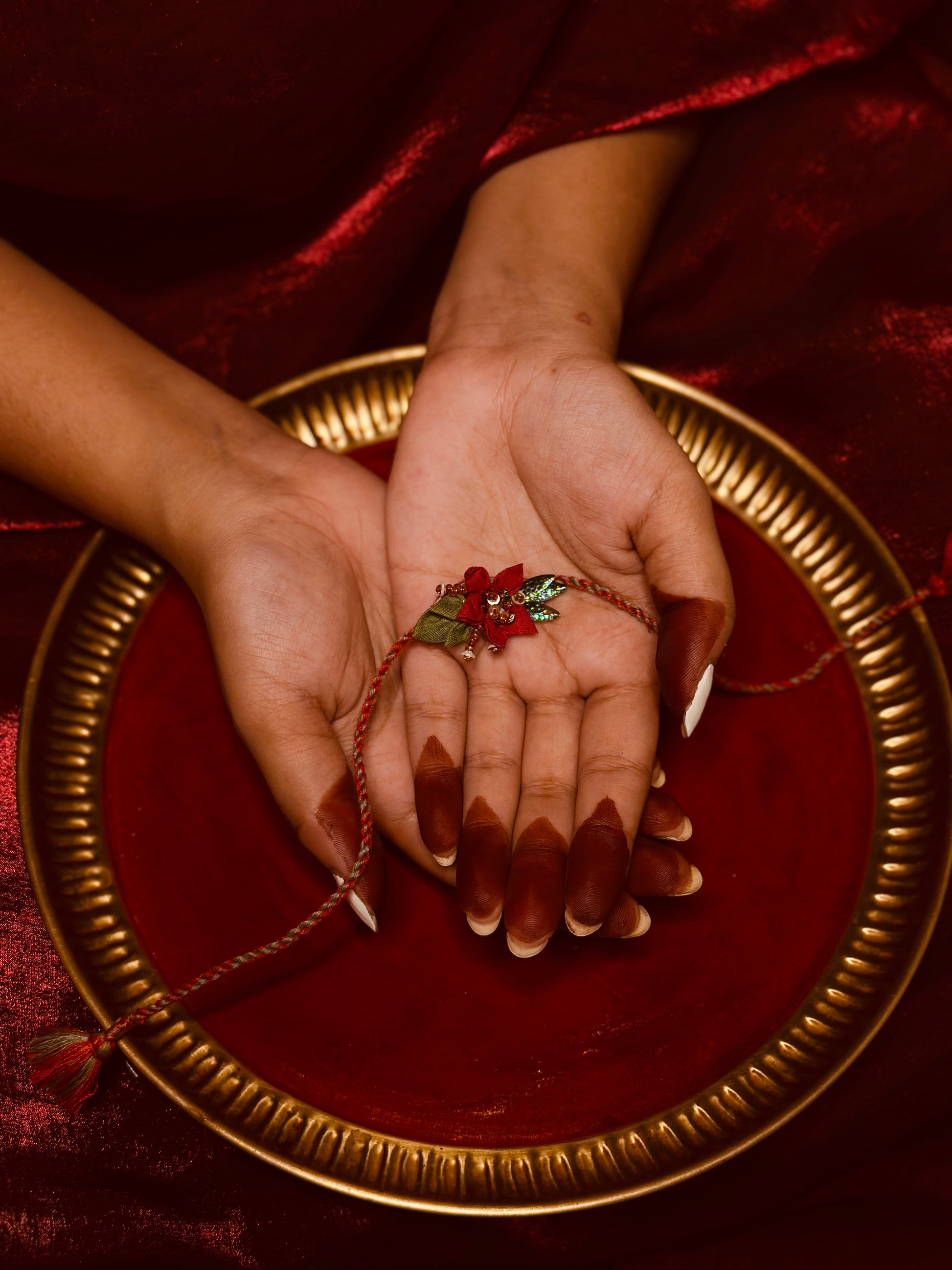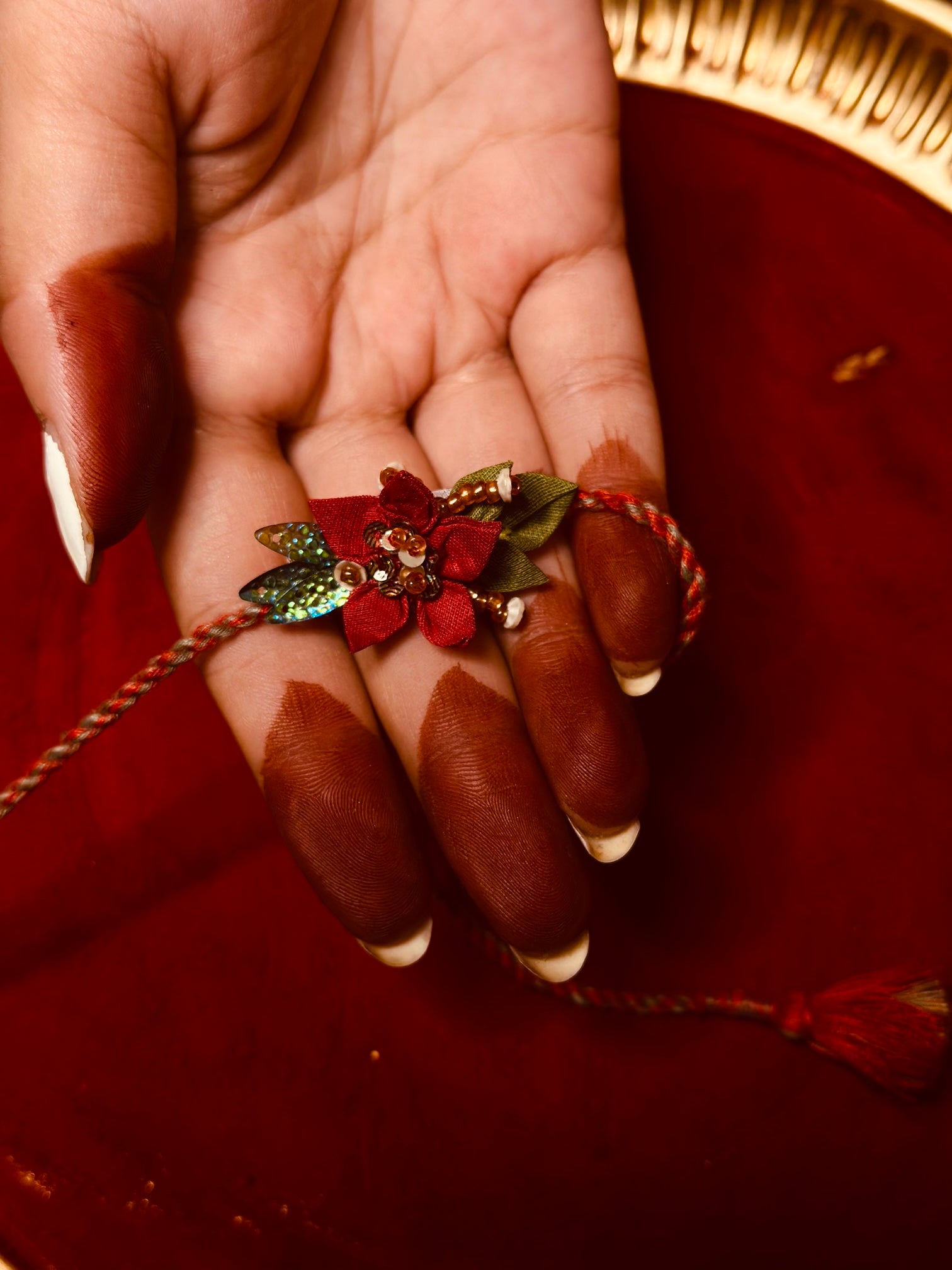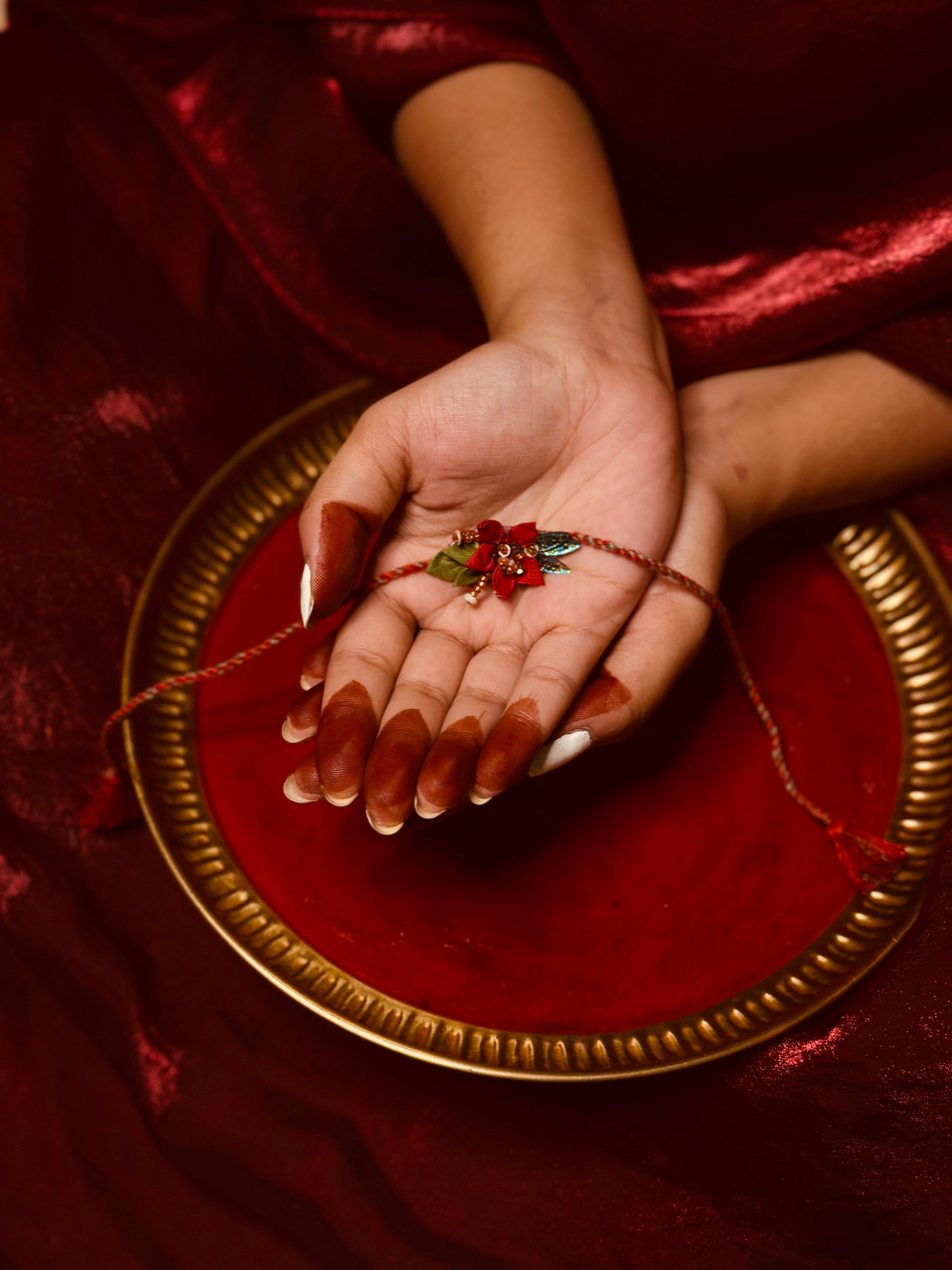 Deep red dori gives the rakhi a rich, festive vibe — hand-braided and made to stand out while honoring tradition.